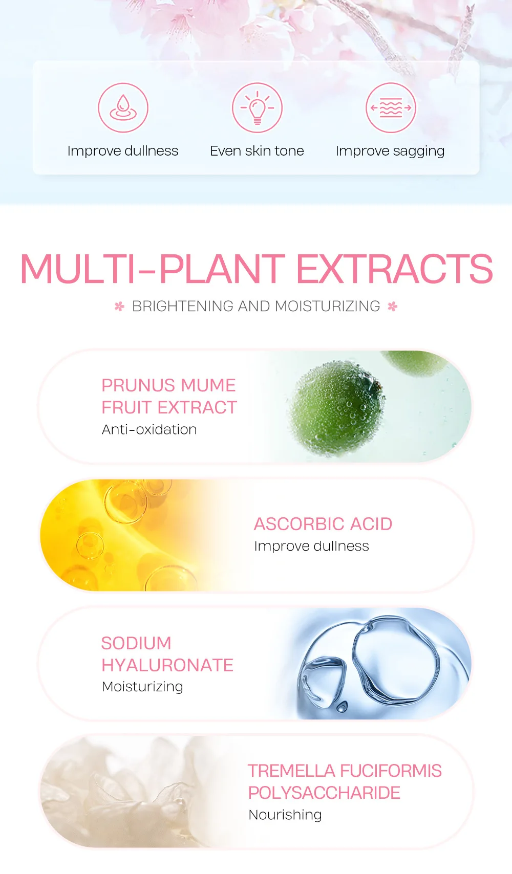 MAIN INGREDIENTS:Prunus Lannosiana Flowor Extract.Prunus Mumo Frult Extract,Ascorbic Acid,Sodium Hyaluronute, Tremella Fuciformis Polysaccharide